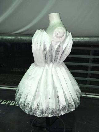 J'ai donc créé cette robe afin de montrer la maniabilité de ce papier. En effet, celui-ci est indéchirable, ce qui l'aide de technique d'origami m'a permis de faire une robe à première vue courte mais qui est adaptable en robe longue. De plus, l'imperméabilité du tyvek rend ce vêtement d'autant plus particulier.